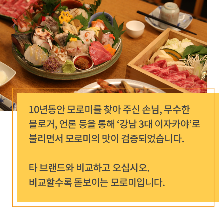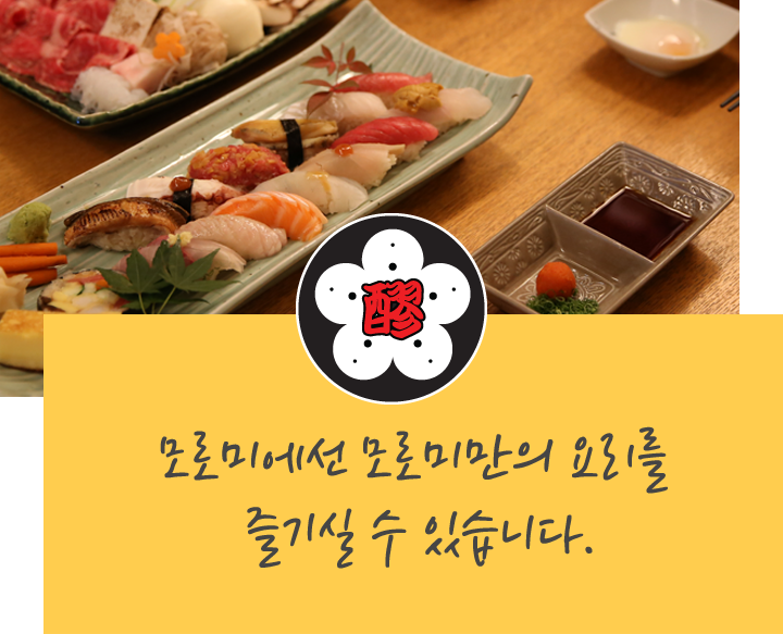 한번 방문하면 나의 소중한 사람들과 다시금 찾고 싶어지게 만드는 고급스러운 인테리어와 넓고 아늑하고 편안하게 즐길 수 부스 좌석, 중요한 비즈니스나 내 사람들과 더욱 가까워 질 수 있는 프라이빗 룸까지. 모로미의 인테리어는 지극히 사람을 향하고 있습니다.